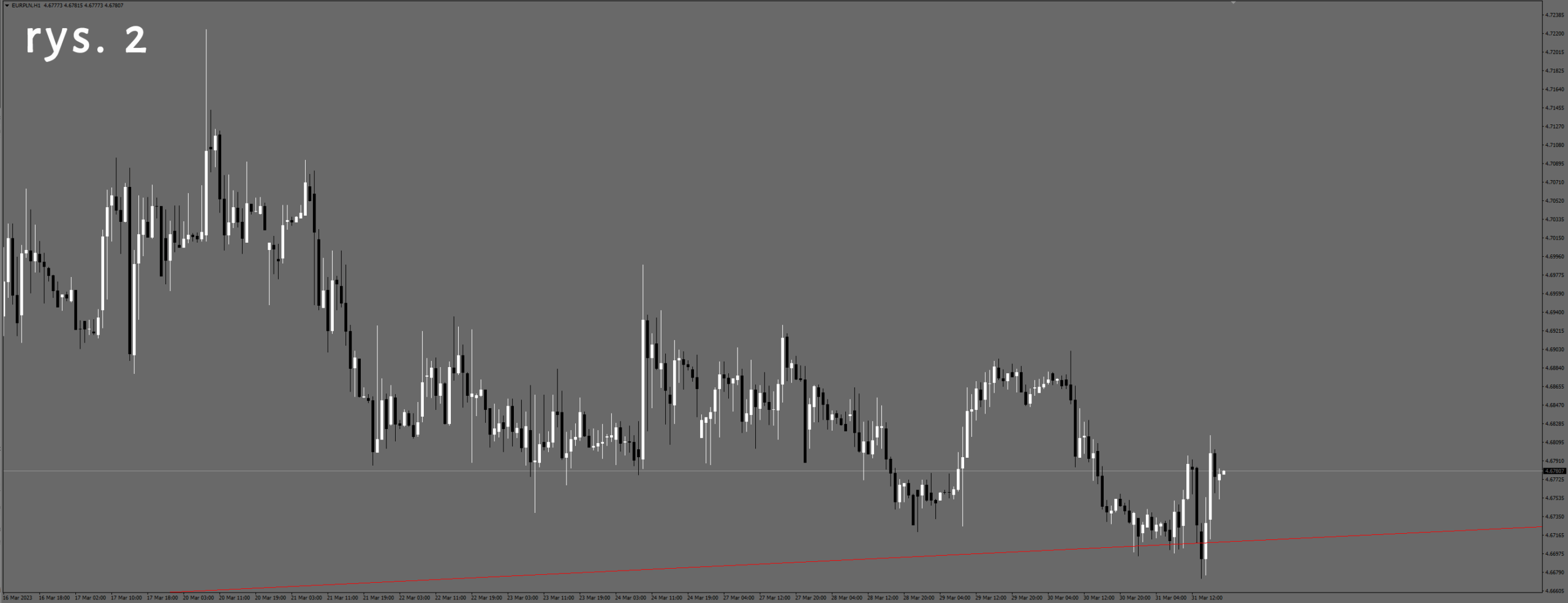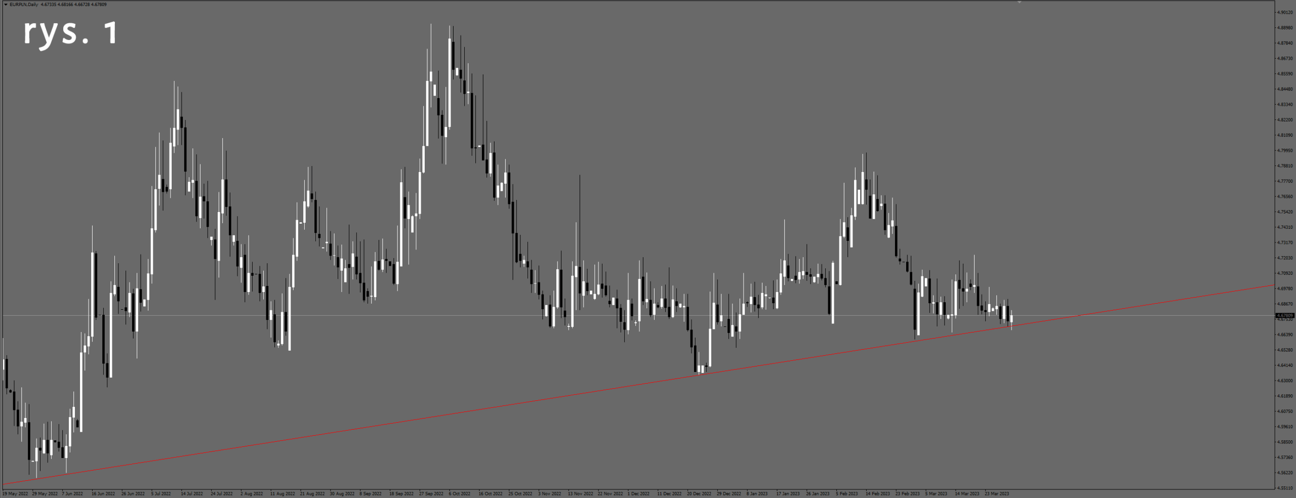 Jeżeli przyjrzymy się dobowemu wykresowi EURPLN (rys. 1) widać, że próbuje przebić linię wsparcia. Jest ona znacząca, ponieważ tworzą ją dołki po powrocie wykresu z wystrzału w momencie wybuchu wojny na Ukrainie.