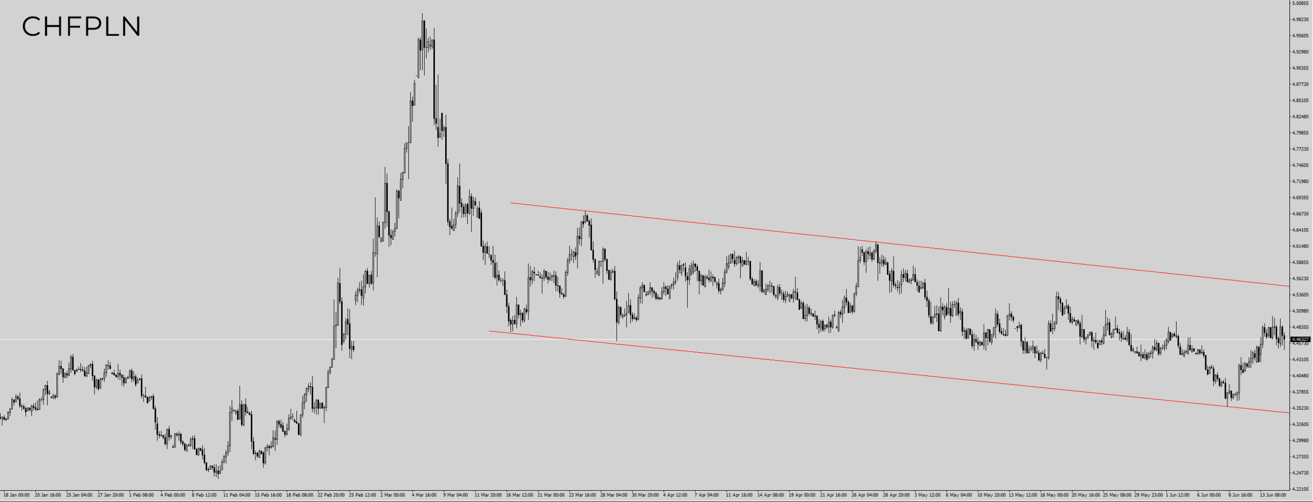 Za to frank szwajcarski podąża w swoim niesamowicie długim kanale. Frank drąży ten kanał od 16 marca. Jest to trend delikatnie zniżkujący.